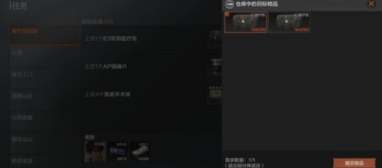 打开任务页面,点击提交会弹出一个窗口,选择里面的E3医疗包进行提交物品,这个任务就完成了。