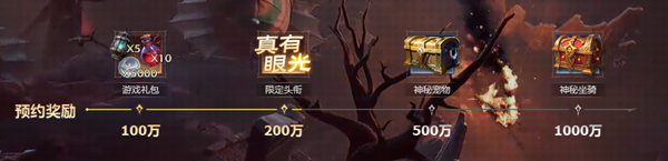 1、100w奖励游戏礼包,200w奖励限定头衔,500w奖励神秘宠物,1000w奖励神秘坐骑。