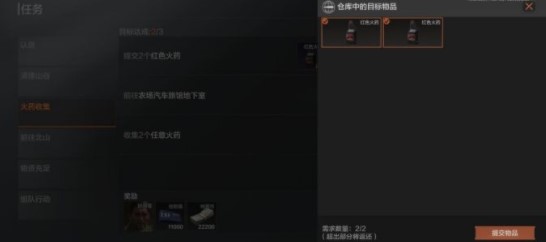一是多跑几次农场地图,去地下室多摸摸,摸到够两个火药之后,点击任务进入任务界面,选择提交会弹出一个页面,选择红色火药,点击提交按钮,提交后就完成这个目标了