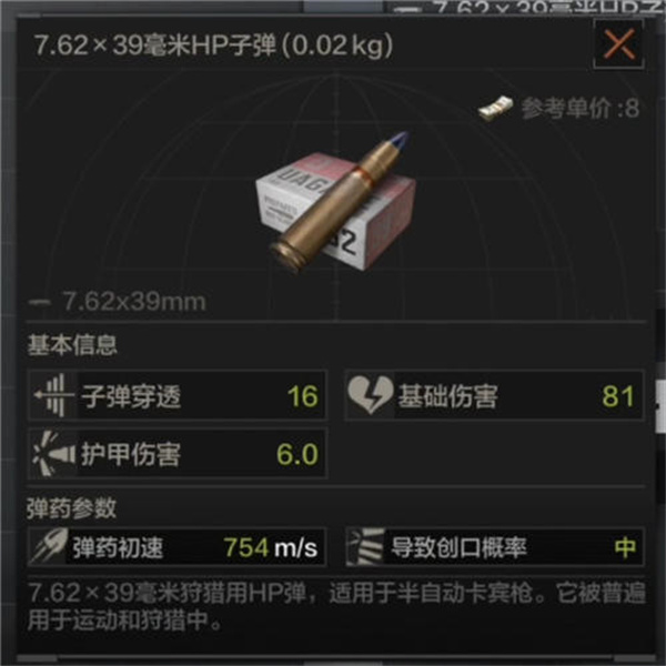 二级子弹:子弹穿透27、基础伤害56、护甲伤害9.2,弹药速度300m/s;