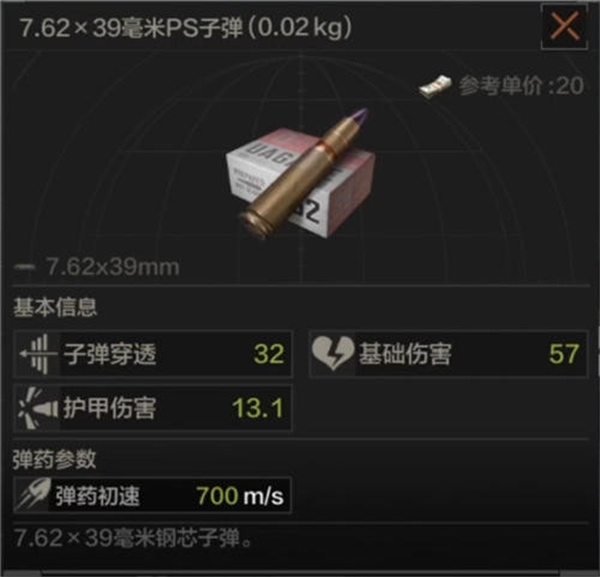 三级子弹:子弹穿透32、基础伤害57、护甲伤害13.1,弹药速度700m/s;