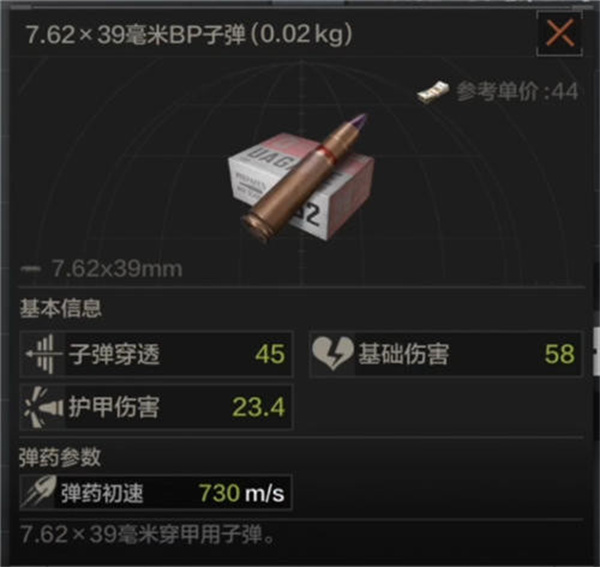 四级子弹:子弹穿透45、基础伤害58、护甲伤害23.4,弹药速度700m/s。