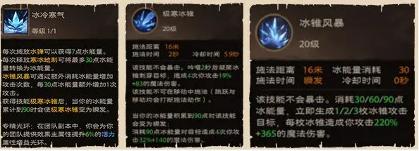 单体泄能高伤技能,消耗30/60/90点冰能量,生成1/2/3根冰锥攻击目标。在点出天赋“极寒冰锥”后会被极寒冰锥替代。