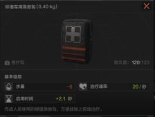 军用急救包的耐久度为120点,恢复人物的健康程度比较可观,治疗速率20/秒,启用时间2.1秒,减少自身水量6点。