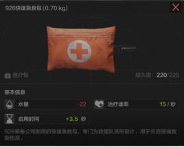926急救包的耐久度是220,对比上面两种药品,这个药品的恢复健康程度可以说是相当高了,治疗速率15/秒,启用时间3.5秒,减少人物水量22。