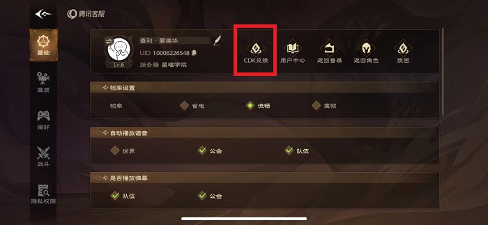 3、在个人基础资料界面中,玩家信息旁边就可以看见cdk兑换入口。