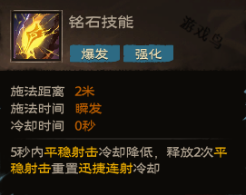 铭石状态:5秒内平稳射击冷却降低,释放2次平稳射击重置迅捷连射冷却