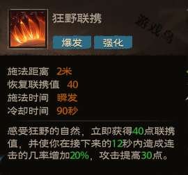 效果:感受狂野的自然,立即获得40点联携值,并使你在接下来的12秒内造成连击的几率增加20%,攻击提高30点。