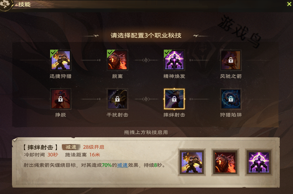 效果:射出绳索箭矢缠绕目标,对其造成70%的减速效果,持续8秒。
