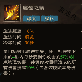 效果:向目标射出酸蚀箭矢,使目标在接下来的4秒内每秒受到你攻击的57%+81点物理伤害,并使你对目标造成的所有伤害提高10%(包含该技能本身伤害)。