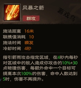 效果:指引箭雨攻击指定区域,在4秒内每秒对区域中的敌人造成你攻击的10%+30点物理伤害,每额外命中一个目标可提高本次100%的伤害,命中人数达到5时,伤害不再提升。