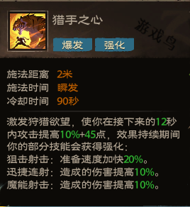 效果:激发狩猎欲望,使你在接下来的12秒内攻击提高10%+45点,效果持续期间你的部分技能会获得强化: