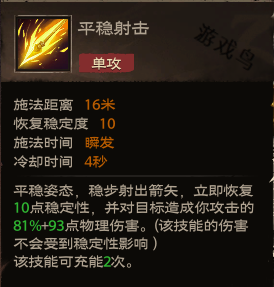 效果:平稳姿态,稳步射出箭矢,立即恢复10点稳定性,并对目标造成你攻击的81%+93点物理伤害。(该技能的伤害不会受到稳定性影响)