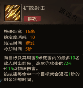 效果:向目标及其周围5米范围内的最多10名敌人射出箭矢,造成你攻击的72%6+115点物理伤害。