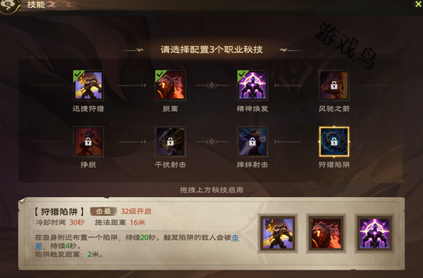 效果:在自身附近布置一个陷阱,持续20秒。触发陷阱的敌人会被击晕,持续4秒。