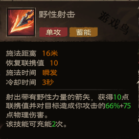 效果:射出带有野性力量的箭矢,获得10点联携值并对目标造成你攻击的66%6+75点物理伤害。