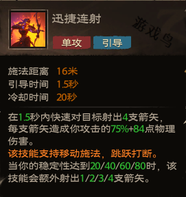 效果:在1.5秒内快速对目标射出4支箭矢每支箭矢造成你攻击的75%+84点物理伤害。