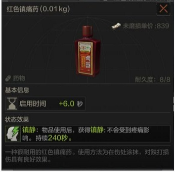 相当于速效止痛药的升级版本,虽然想必速效止痛药时间减少30秒但是多了两次的使用次数,而且也没有水分和能量的扣除。在当前版本的市场相对贵了1000的价格多了两次使用次数,性价比其实不是很高,毕竟1000也能够再买一次速效止痛药。