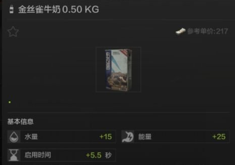 这个牛奶饮用后水量加15,能量加25,启用时长是5.5秒。