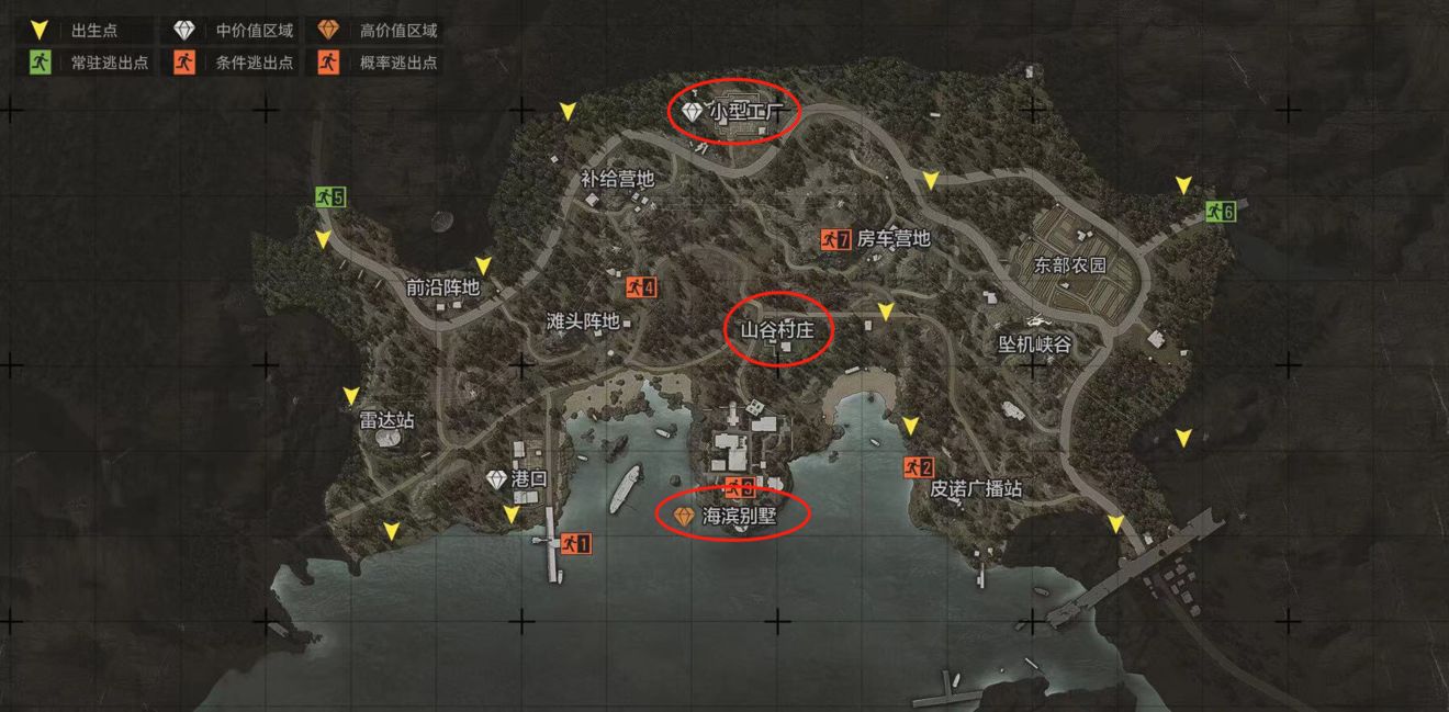 中部的主要资源点有北部的小型工厂,和南边的山谷村庄和最南边的海滨别墅。