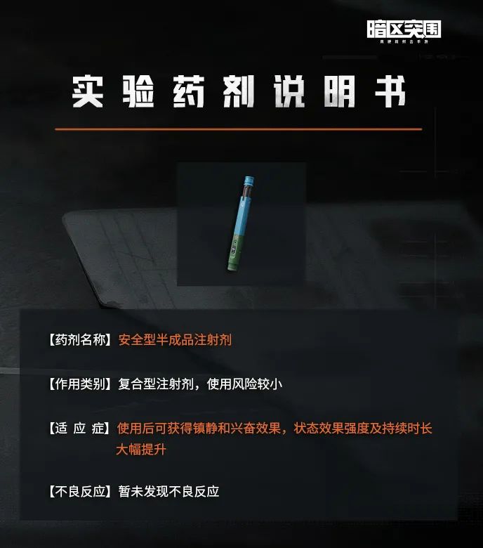 活动期间暗区各处的高级武器箱和专业急救包中,以及在暗区各地出现的巡逻卫队身上有概率找到两种新型药剂:【危险型半成品注射剂】和【安全型半成品注射剂】。