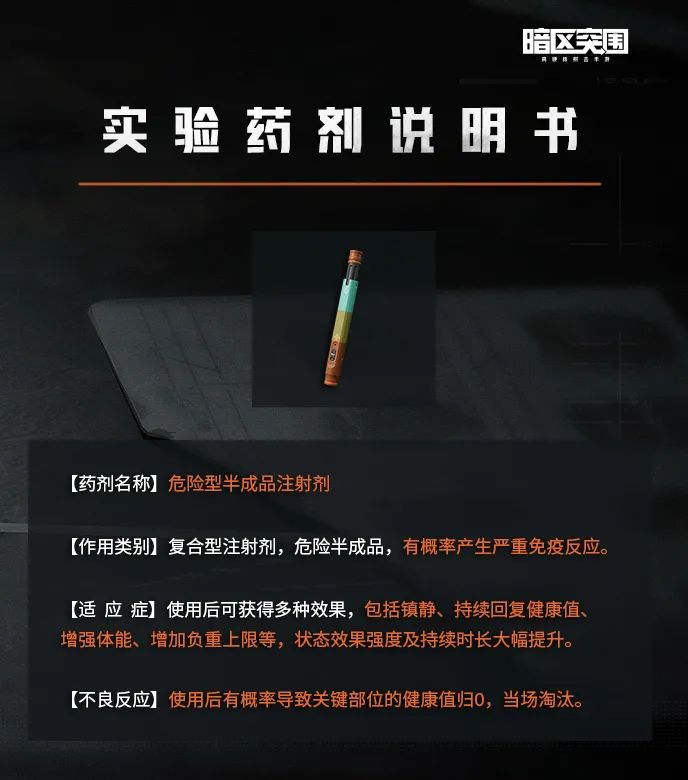 看过其他注射剂说明的先锋对实验室这个地方应该印象深刻,没错,本次上线的实验药剂又双叒叕是由实验室生产。不过由于当时研发技术不够成熟,这批半成品药剂存在一定使用风险,不过高风险高收益,这批药剂的效果也非常不错,想要使用新型药剂的先锋们千万要仔细阅读说明书!