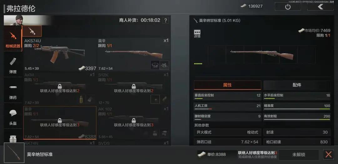 好感度到3级后,你还可以直接用柯恩币从他这里买到玩家们十分钟爱,使用频次极高的莫辛纳甘步枪,配套的子弹、3.5倍镜和消音器的换购也将同时解锁,助你成为跑狙大军中的一员。