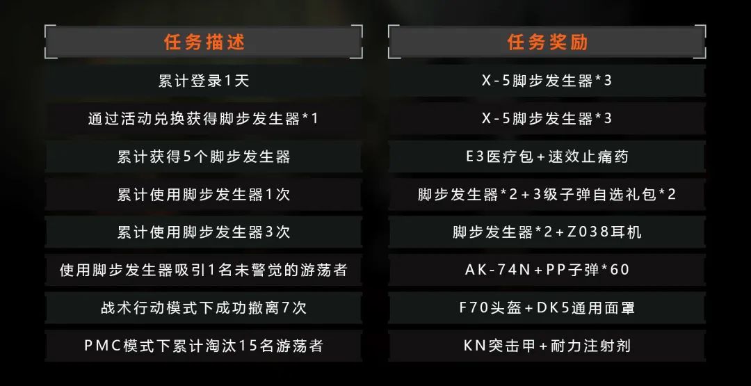 活动内容:先锋们进入活动中心【辨声行动】页面,累计登录1天就能领取脚步发生器,此外,随着先锋们在局内熟练使用脚步发生器,逐项完成挑战任务,即可获得枪械、子弹、盔甲、耐力注射剂等任务奖励。
