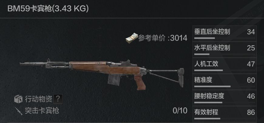 BM59同样是一款入门级的突击卡.宾.枪,比起前面两款卡.宾.枪,它使用的弹药是威力更大7.62x51毫米子弹。使用88基础伤害的UN弹攻击2级甲以下的目标时,击中胸口就可一击制敌,在赛季初期是比较好用的。不过其除了换大弹匣和加装瞄具之外无法做进一步改装,因此出场率远不如Hunter。