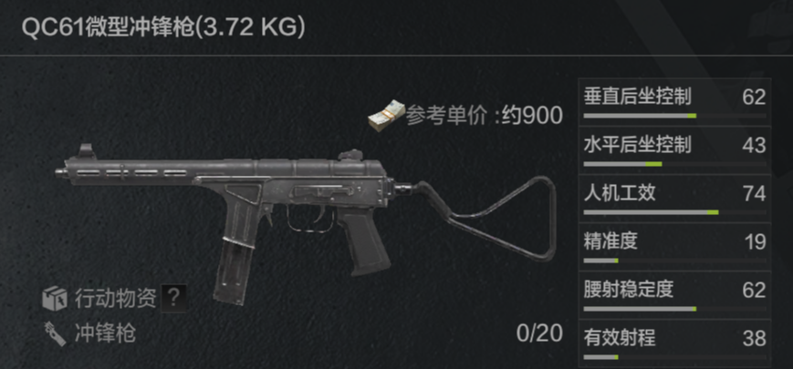QC61是一把局内游荡者经常持有的冲锋枪,其射速与MPF45一样为700发/每分钟,但大部分基础属性都比MPF45略高(仅腰射稳定度较低)。使用的是可直接从联络人处购买的7.62x25毫米口径子弹,由于没有高级子弹可选,赛季中后期比较乏力。