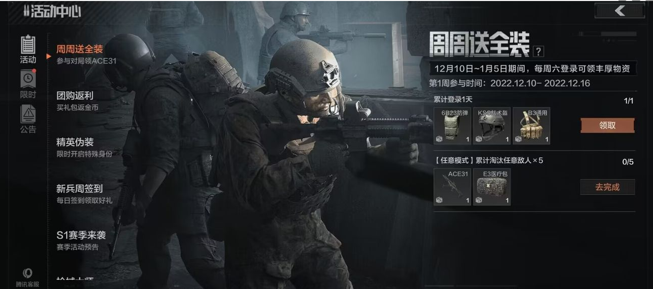 你还在害怕起全套破产吗?你还在担心自己的武器护甲不够自己造的吗?你还在因为不舍得起全套进暗区从未勇闯封锁区吗?周周送全装福利大放送活动来了!只要每周六登录及完成对局任务即可领取4级装备及高级枪械。本周奖励为ACE31突击步枪、6B23防弹、KSS战术头盔、B3通用弹挂,后续奖励更丰厚,每周六与你不见不散!先锋们不要忘记登录,领取每周属于你的全装包!>>>> 精英伪装者