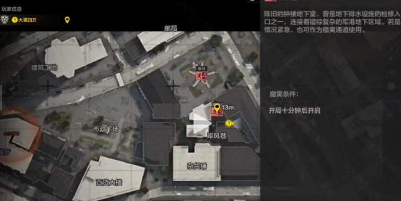 下水道撤离点的位置如下图所示,在岸风巷附近,在游戏开局10分钟后就会开启;