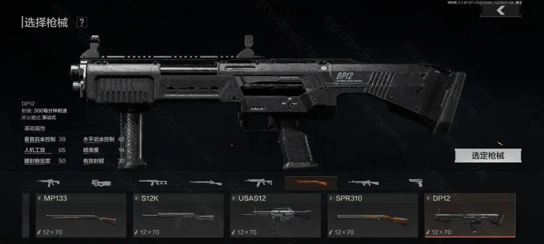 第三把是新型的泵动式霰弹枪DP12,它采用无托设计、结构紧凑,弹药由两根独立枪管供弹,可以支持短时间内双发射击,可以视为SPR310的升级版。不过由于没有弹匣供弹,只能手动单发装填,因此交战时最好不要将子弹倾泻一空,最好预留几发应对突发情况。