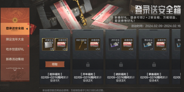 活动说明:龙年迎福利,新春好礼到!2月9日当天,先锋们登陆游戏即可领取2x2防弹安全箱(3天)!活动期间累计登录更能收获限时万能钥匙、套装券、新春购物卡等丰厚奖励!