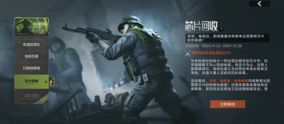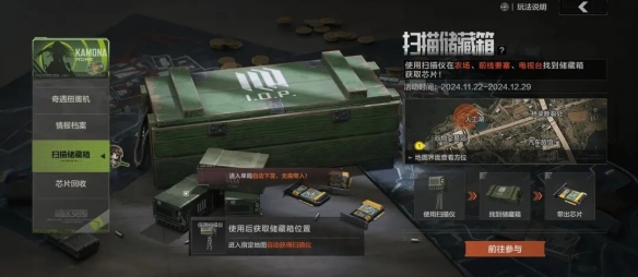 活动期间前往农场、前线要塞、电视台,将自动装备信源扫描仪,进入地图后在局内使用便会在地图上以橙色圆圈显示限时出现的芯片储藏箱的范围,前往搜索芯片储藏箱必定获得高精密芯片。