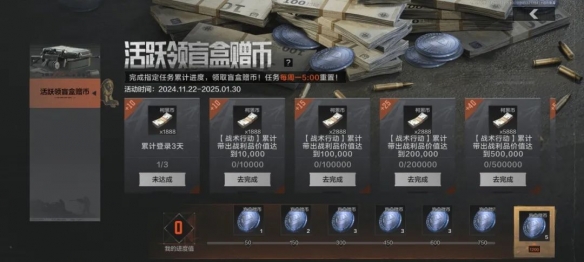 完成每周任务,推进进度即可领取盲盒增币,这种好事就在现在!只要先锋们完成对局,即可根据带出战利品价值累积任务进度并领取柯恩币奖励,每周最多累计带出价值100万的战利品即可完成全部任务,获得150点进度值,当达到指定进度值时就能领取盲盒赠币了。