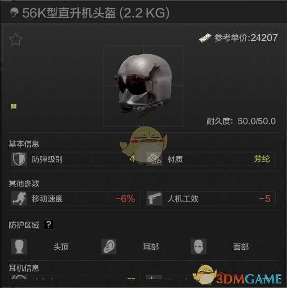 50耐久,头顶耳部防护,四级头当中最硬的头盔,材料是高贵的装甲钢,加装面罩可以达成头部四级全防,但问题在于会有一般等级的声音阻断,同时debuff较高,而且硬归硬,但再硬它也只是个四级头。