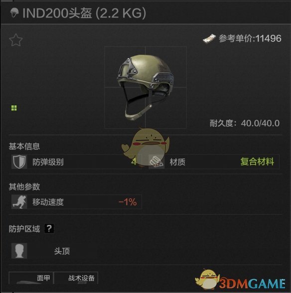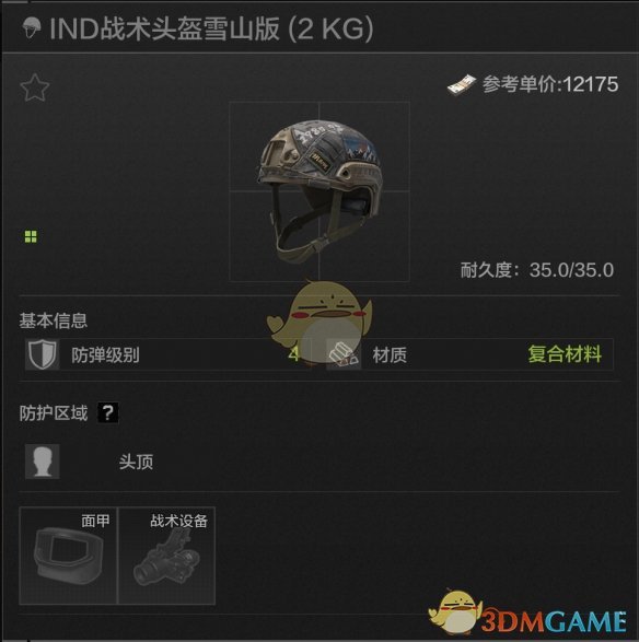 35耐久,头顶防护,IND战术的皮肤版,可以从弗雷德那里借来用,完全没有debuff扣除,性能可以但价格不太美丽,一般也不会有人用这个头盔。