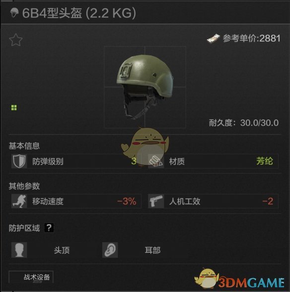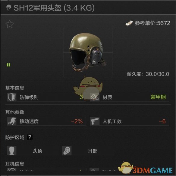 30耐久,头部耳部防护,唯一真神!材料是高贵的装甲钢不说,还有比肩Z038耳机的拾音和降噪能力,带上一个防毒面具能直接勇闯任何地图,唯一的问题是人机功效扣除太高,但瑕不掩瑜,debuff不多点这头就无敌了,非常推荐,直接登顶暗区必吃榜榜首!