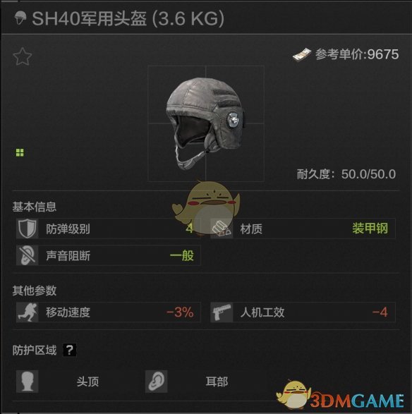 50耐久,头顶耳部防护,四级头当中最硬的头盔,材料是高贵的装甲钢,加装面罩可以达成头部四级全防,但问题在于会有一般等级的声音阻断,同时debuff较高,而且硬归硬,但再硬它也只是个四级头。