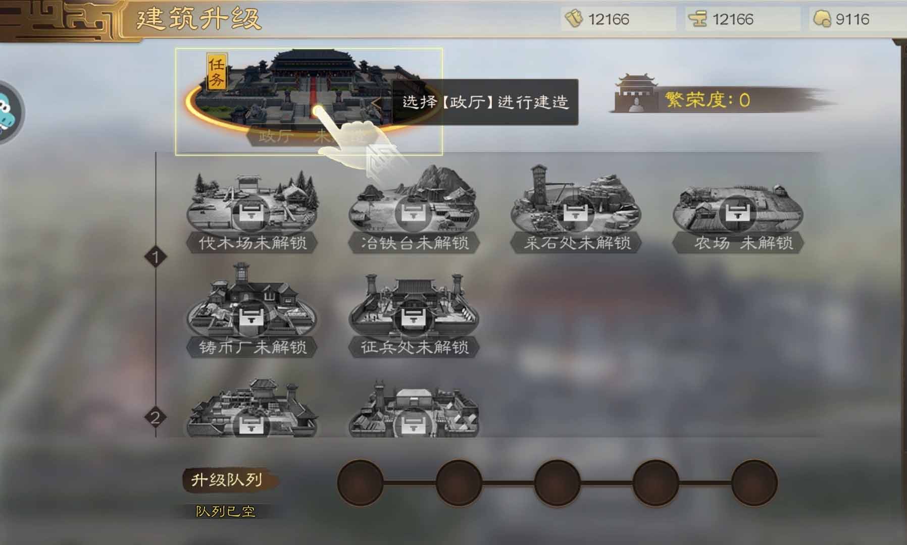 ①升级政厅才会解锁下方更多建筑的建造;