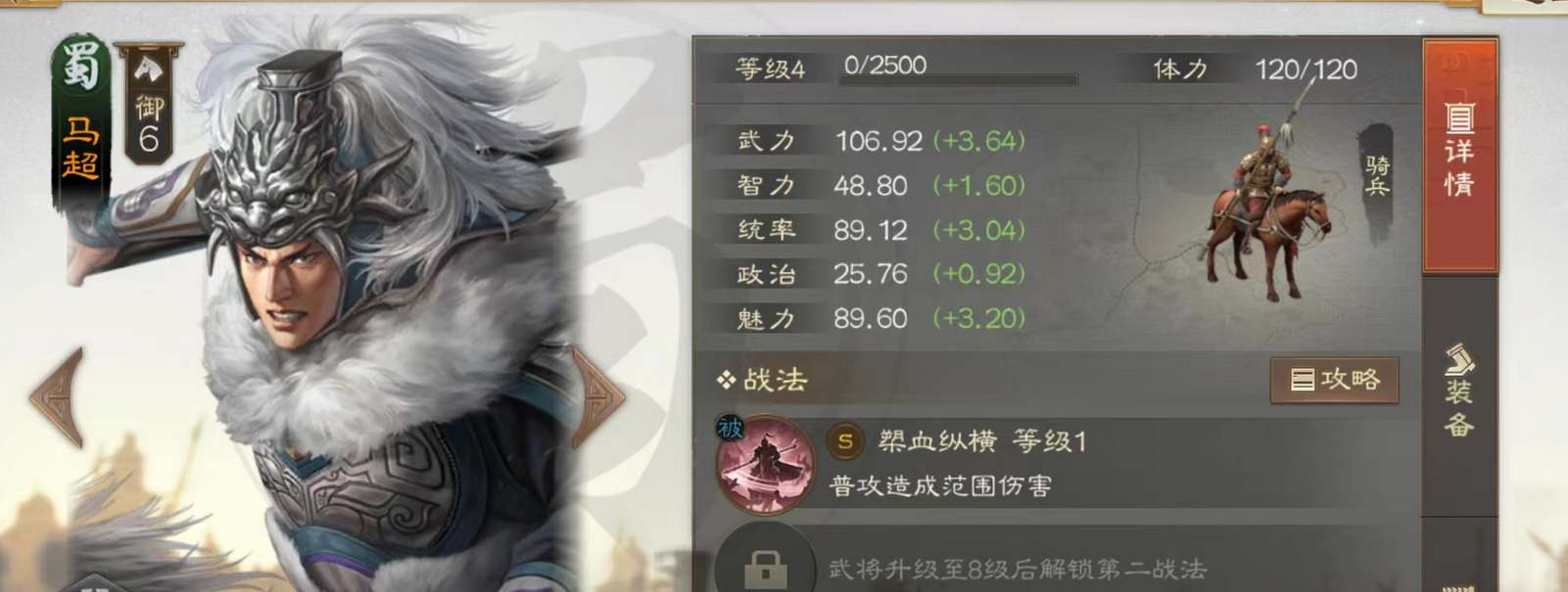 1、马超是统帅骑兵类型的武将,擅长冲锋,武力值成长高,但是生存能力较差。战法【槊血纵横】普攻会造成范围伤害;