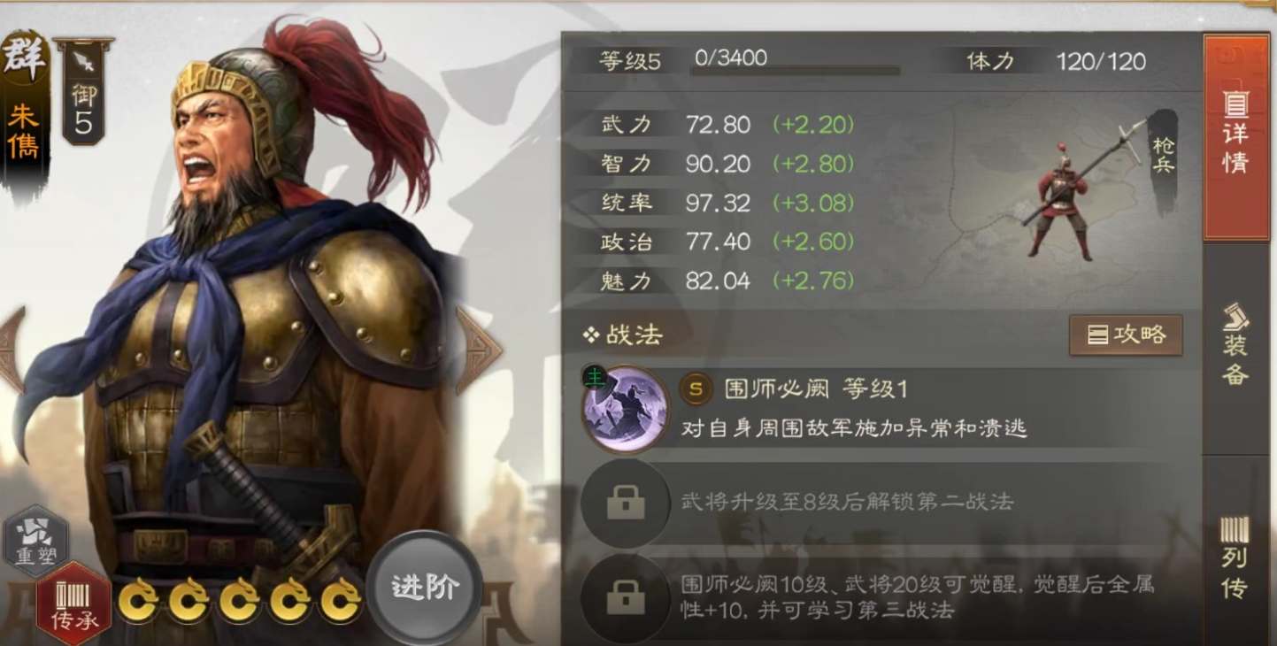1、朱儁统率枪兵,武将的智力、统率、魅力属性都十分优秀,战法技能可以使周围2格内的群体敌军造成的伤害降低,并为其施加溃逃buff,在回合结束时造成额外伤害;