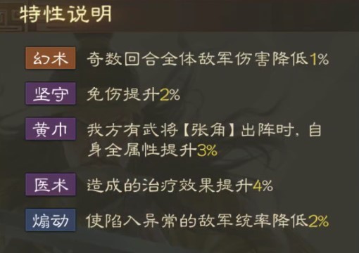 黄巾:我方有武将[张角]出阵时,自身全属性提升3%