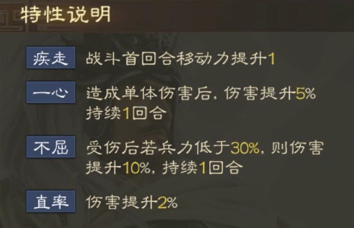 不屈:受伤后若兵力低于30%,则伤害提升10%,持续1回合