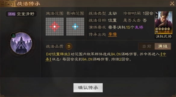 [对敌方释放]对敌军单体造成62.0%谋略伤害,并造成并造成40% [断粮]效果和2层[中毒]:每回合受到62.0%谋略伤害。[断粮]与[中毒]效果皆可叠加。持续5回合。