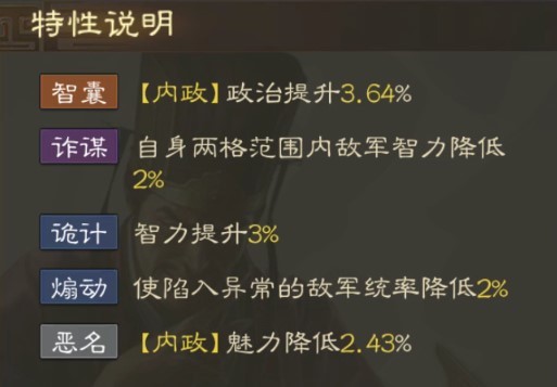 诡计:智力提升3%煽动使陷入异常的敌军统率降低2%