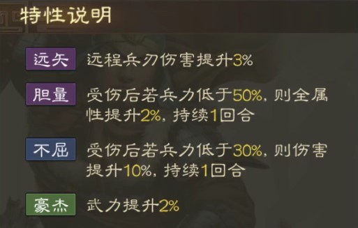 不屈 受伤后若兵力低于30%,则伤害提升10%,持续1回合