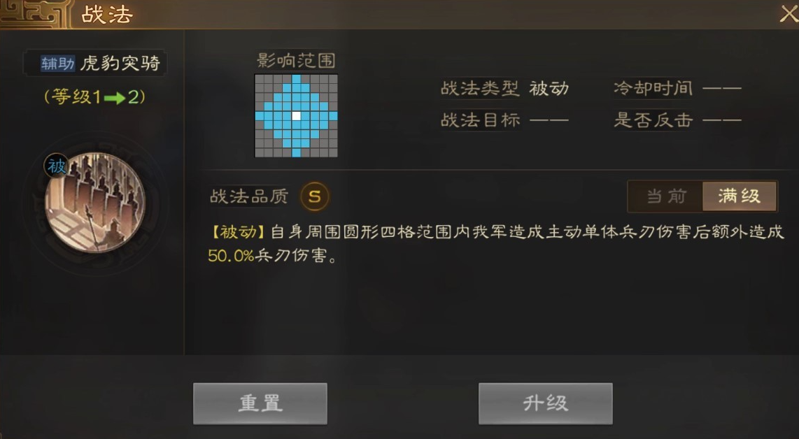 [被动]白身用围回形四格范围内我军造成主动单体兵刃伤害后领外造成50.0%兵刃伤害。