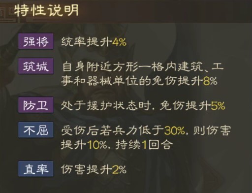 不屈 受伤后若兵力低于30%,则伤害提升10%,持续1回合